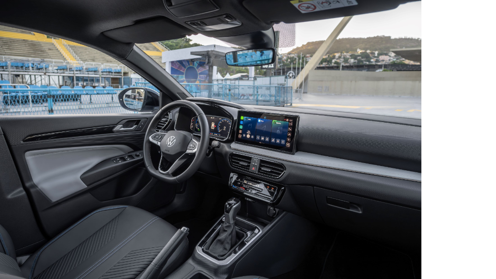 O acabamento interno da versão Outfit é um dos destaques. Os bancos têm revestimento com material sustentável, o painel traz textura exclusiva e há iluminação ambiente em LED. O painel de instrumentos é digital, com tela de 10,25 polegadas, e a central multimídia VW Play Connect oferece pareamento sem fio com Android Auto e Apple CarPlay.